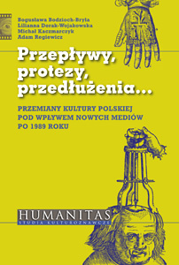 Okładka książki: Bogusława Bodzioch-Bryła, Lilianna Dorak-Wojakowska, Michał Kaczmarczyk, Adam Regiewicz – Przepływy, protezy, przedłużenia… Przemiany kultury polskiej pod wpływem nowych mediów po 1989 roku wydanej w serii HUMANITAS – Studia kulturoznawcze